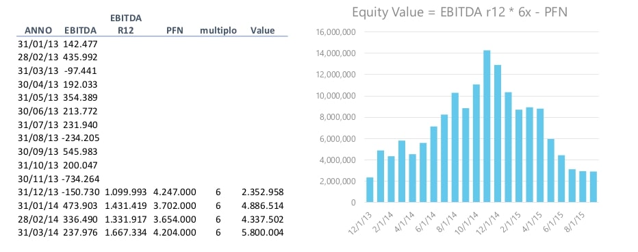 • Tuttavia il mondo dell’M&A e dei fondi di Private Equity abitualmente semplifica e riporta anche valutazioni complesse alla formula EBITDA*Multiplo – PFN (intesa generalmente come debito finanziario)